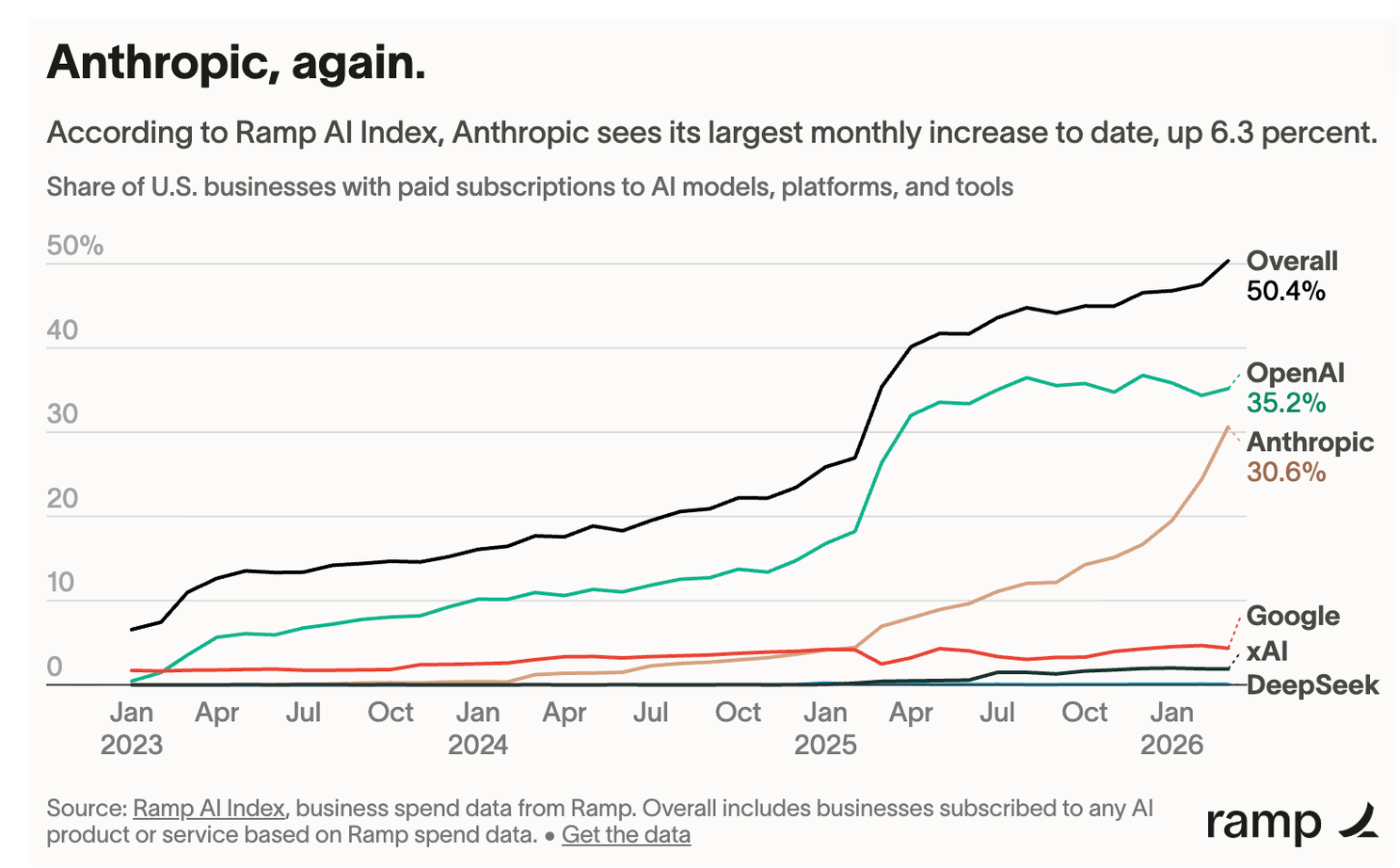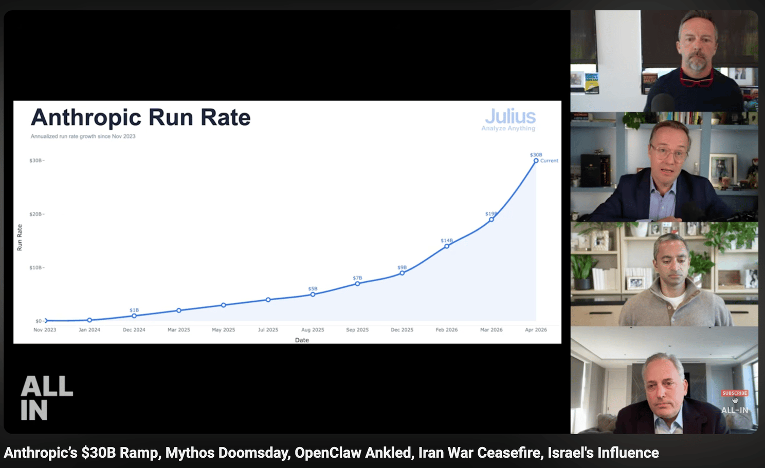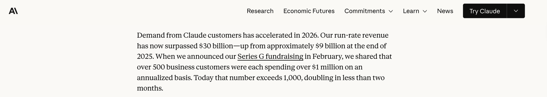 Anthropic's run rate has now surpassed $30 billion. Over 1,000 business customers each spending more than $1 million per year, doubling in under two months.