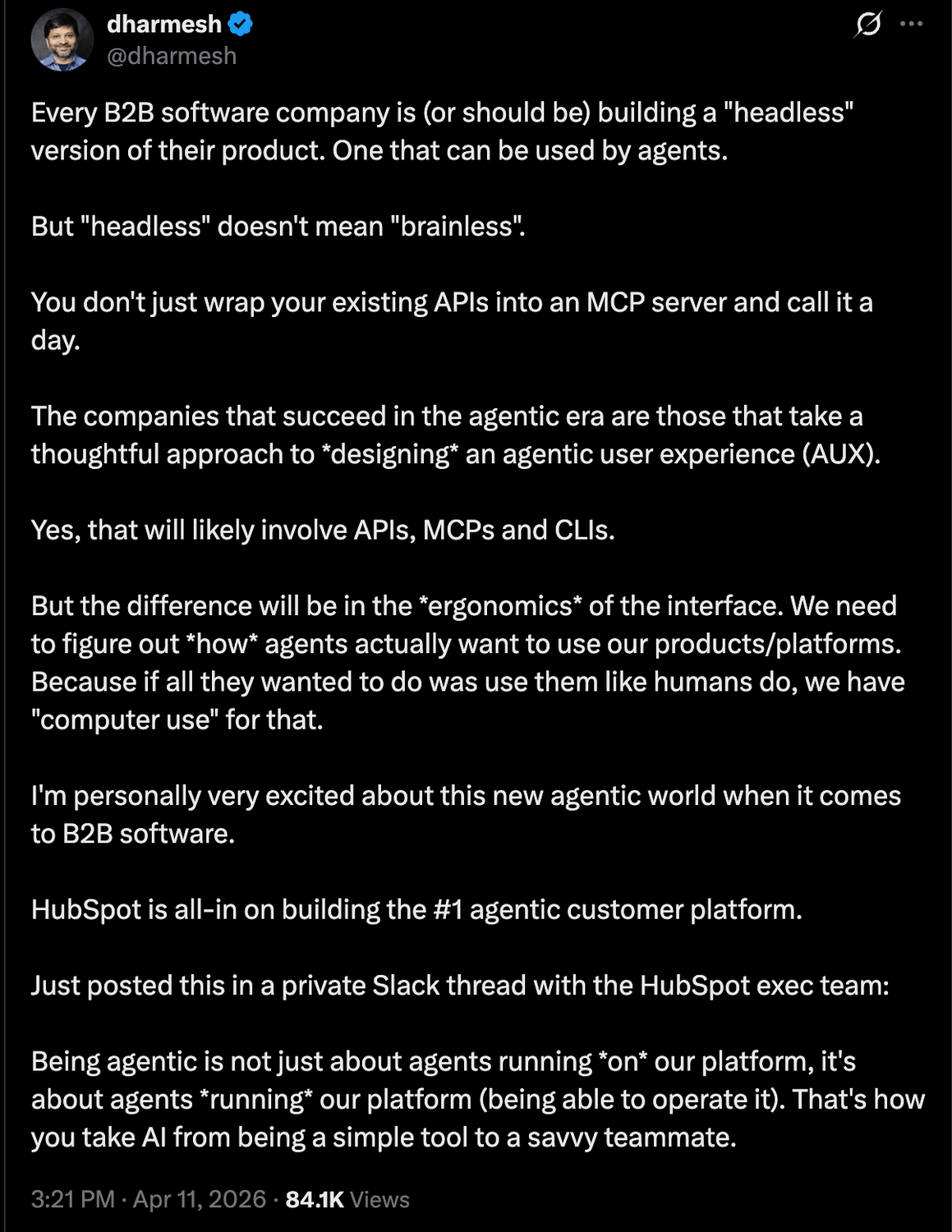 Dharmesh described being agentic is not just about agents running on their platform. It is about agents running their platform.