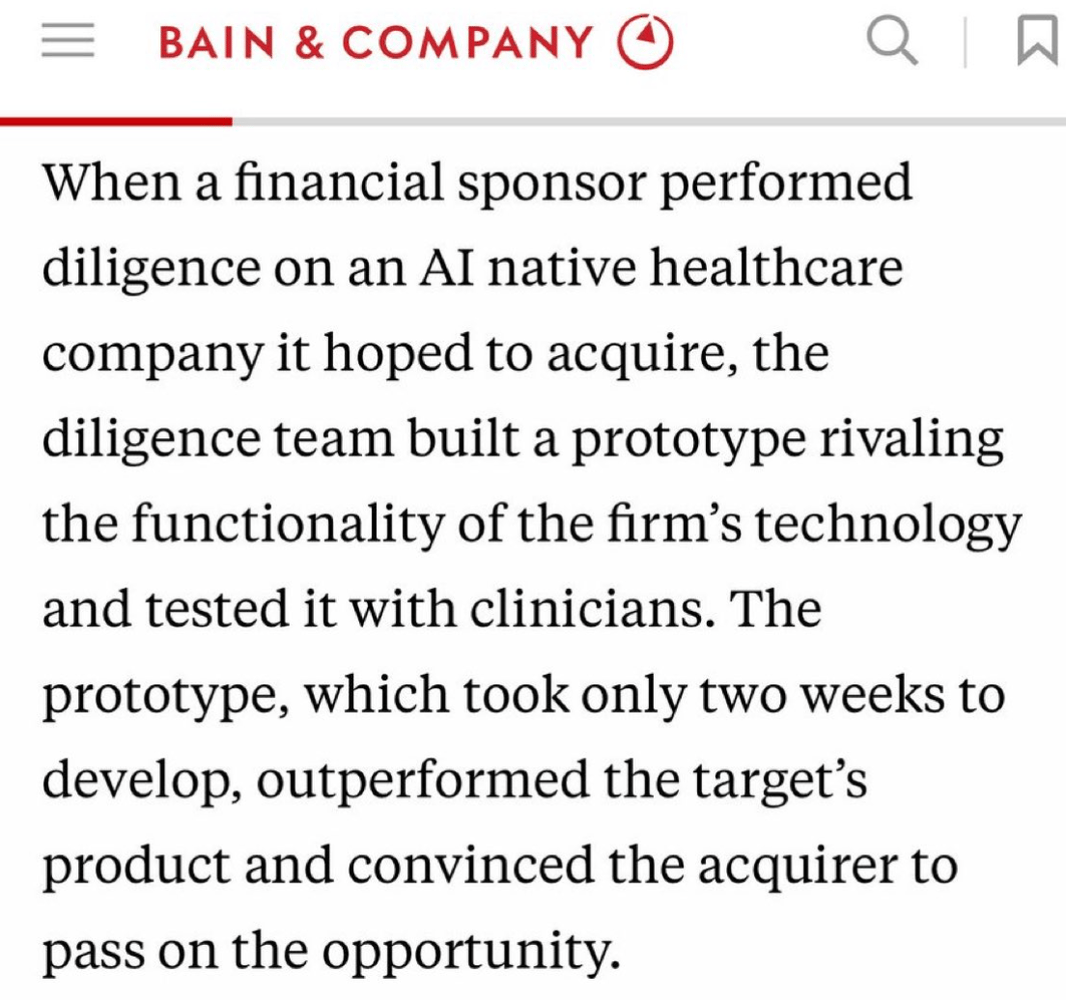When a financial sponsor's due diligence team, powered by AI-native tooling, built a competing prototype in two weeks that outperformed the acquisition target's own product, the deal died.